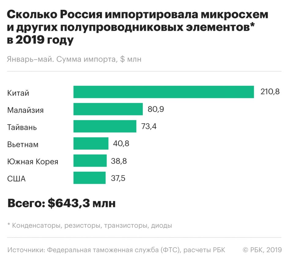 В январе-апреле 2019 года объем российского экспорта интегральных электросхем вырос на 10% по сравнению с аналогичным периодом 2018 года и составил 15,2 млн долларов.