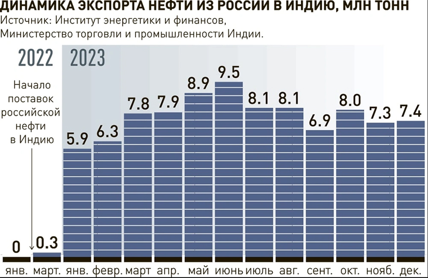 В экспорте доля «недружественных» рынков сбыта также снизилась — с 57% до 15%, а Китая — возросла с 13% до 28% (санкции на вывоз начали действовать позднее, а скидки на нефть позволили перенаправить поставки).