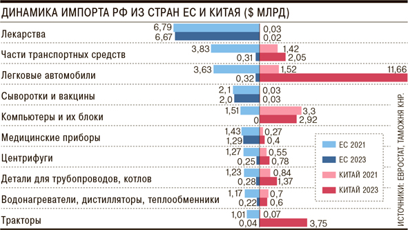 Сжатие и рост поставок происходили неоднородно (см. график): заметнее всего изменения на уровне товарной группы — по поставкам техники. Прямые ее поставки из ЕС почти прекратились, но замещение китайскими товарами наблюдается только в части тракторов и легковых автомобилей при слабом росте поставок частей и комплектующих: речь идет в первую очередь об импорте готовой продукции. Это указывает на ограниченный результат усилий по локализации производства и сборки китайских автомобилей, замечают авторы. Объемы же импорта «гуманитарных» европейских товаров (лекарства, вакцины, медицинское оборудование) практически не изменились, несмотря на логистические проблемы и ограничения трансграничных расчетов. Ввоз лекарств и медоборудования из Китая остался на крайне низком уровне.