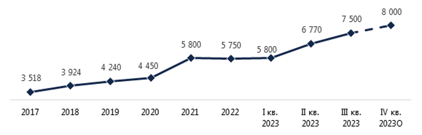 – Согласно предварительным данным консалтинговой компании NF Group, в 2023 года объем сделок на рынке Санкт-Петербурга и Ленинградской области превысит 733 000 кв. м, что на 11% выше аналогичного показателя рекордного 2021 года. Объем ввода составит не менее 363 000 кв. м. Доля вакантных площадей находится на около нулевом уровне, ставки аренды продолжат рост и по итогам года достигнут 8 000 руб./кв. м/год triple net.