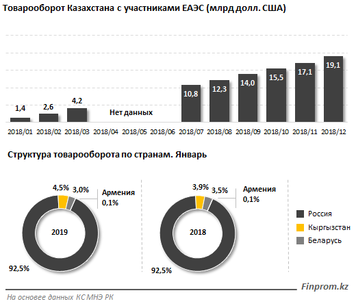 При этом рабочая группа констатировала сохраняющийся дисбаланс в торговле как по соотношению экспорта и импорта (последний почти в два раза меньше), так и по неравномерности ее распределения между странами ЕАЭС (более 95% торговли приходится на Россию).