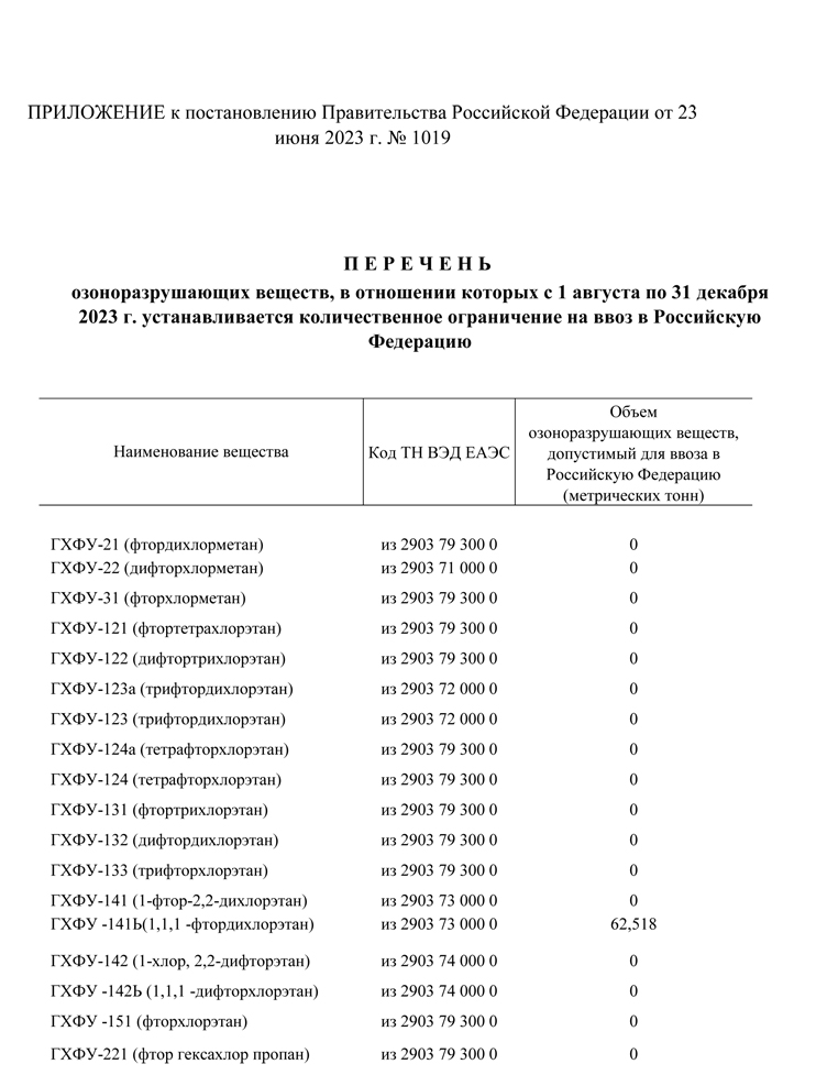 Постановление № 1019 от 23-06-23, О введении временного количественного ограничения на ввоз озоноразрушающих веществ в Российскую Федерацию в 2023 году